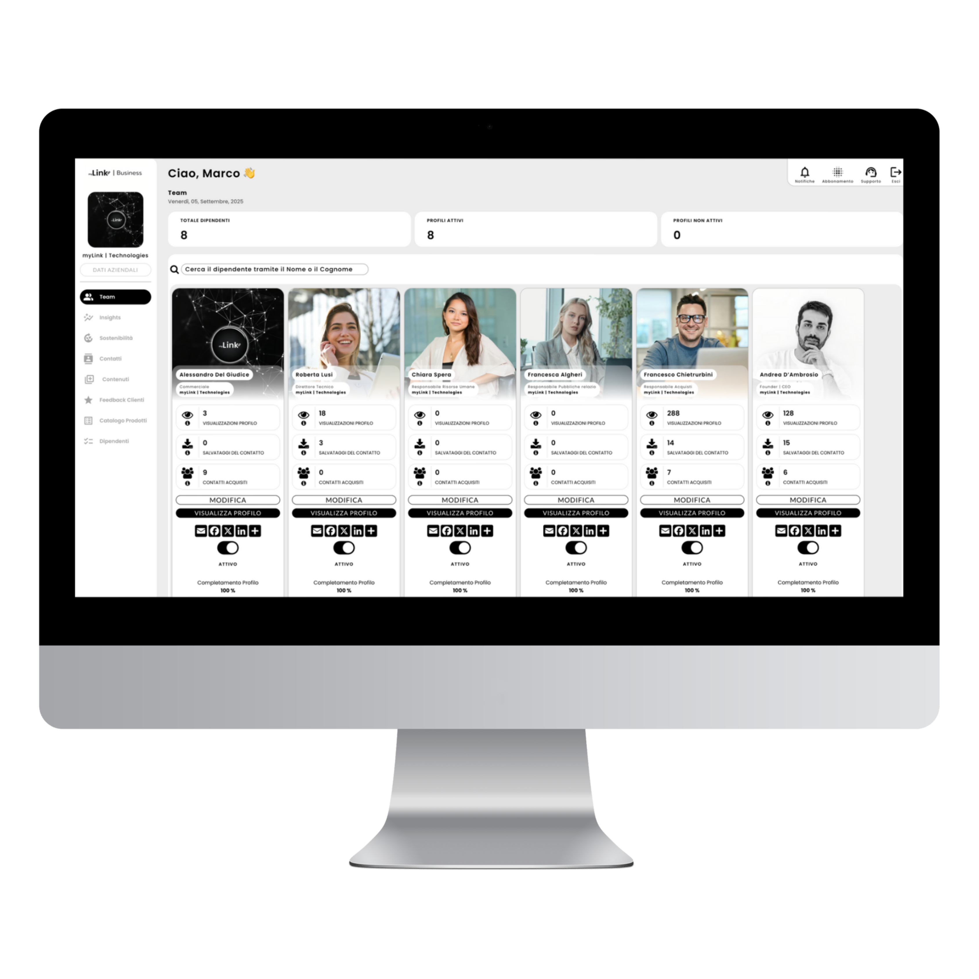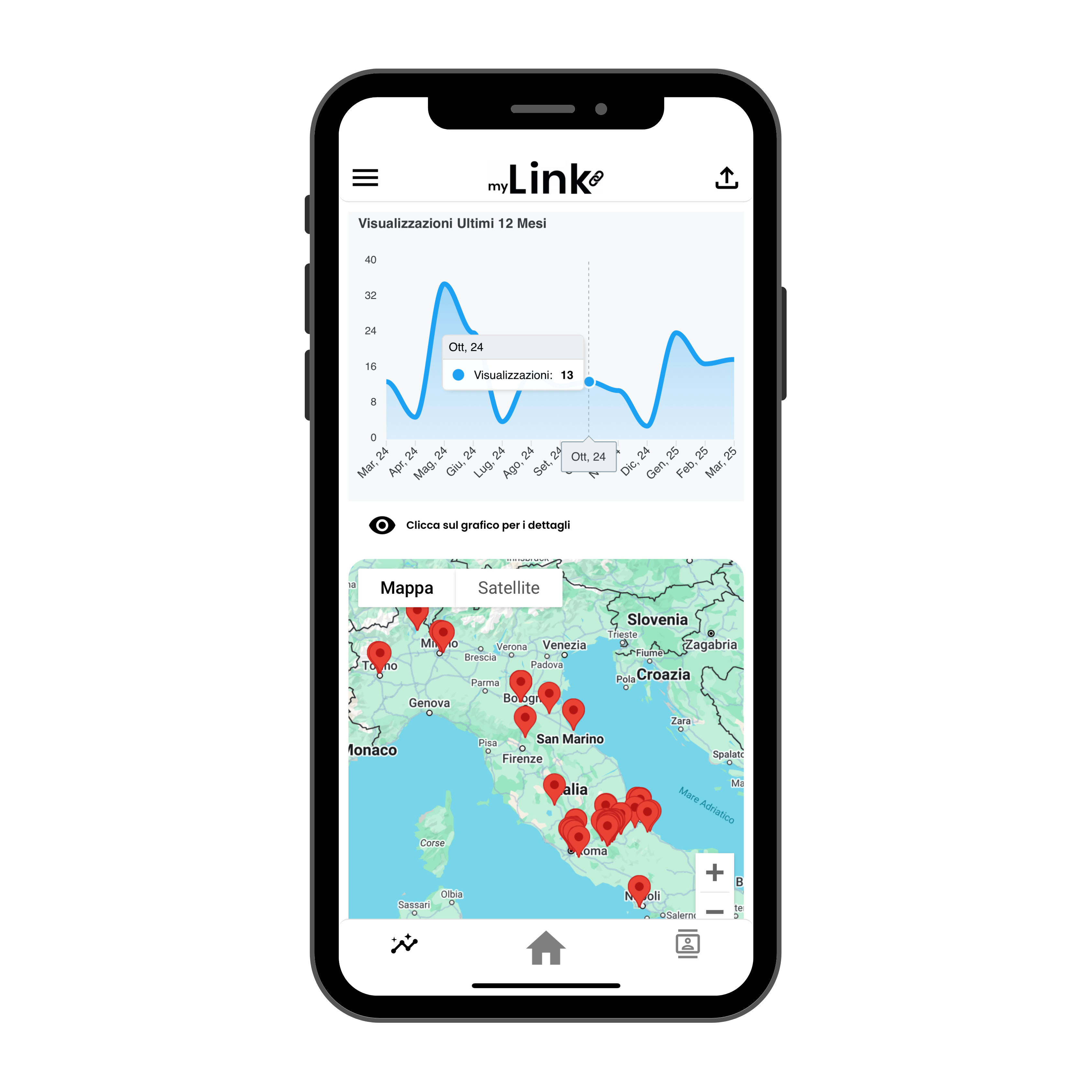Ottieni l'accesso a grafici dettagliati che ti permettono di vedere in tempo reale quante volte e dove il tuo Biglietto da Visita Digitale myLink è stato visualizzato (grazie alla mappa interattiva), quante persone con cui hai scambiato il tuo contatto l'hanno salvato nella loro rubrica, quali sono le icone presenti sul tuo profilo più cliccate ed il loro CTR (Click-Through Rate), puoi vedere quanta carta e quanta co2 stari risparmiando e molto altro.