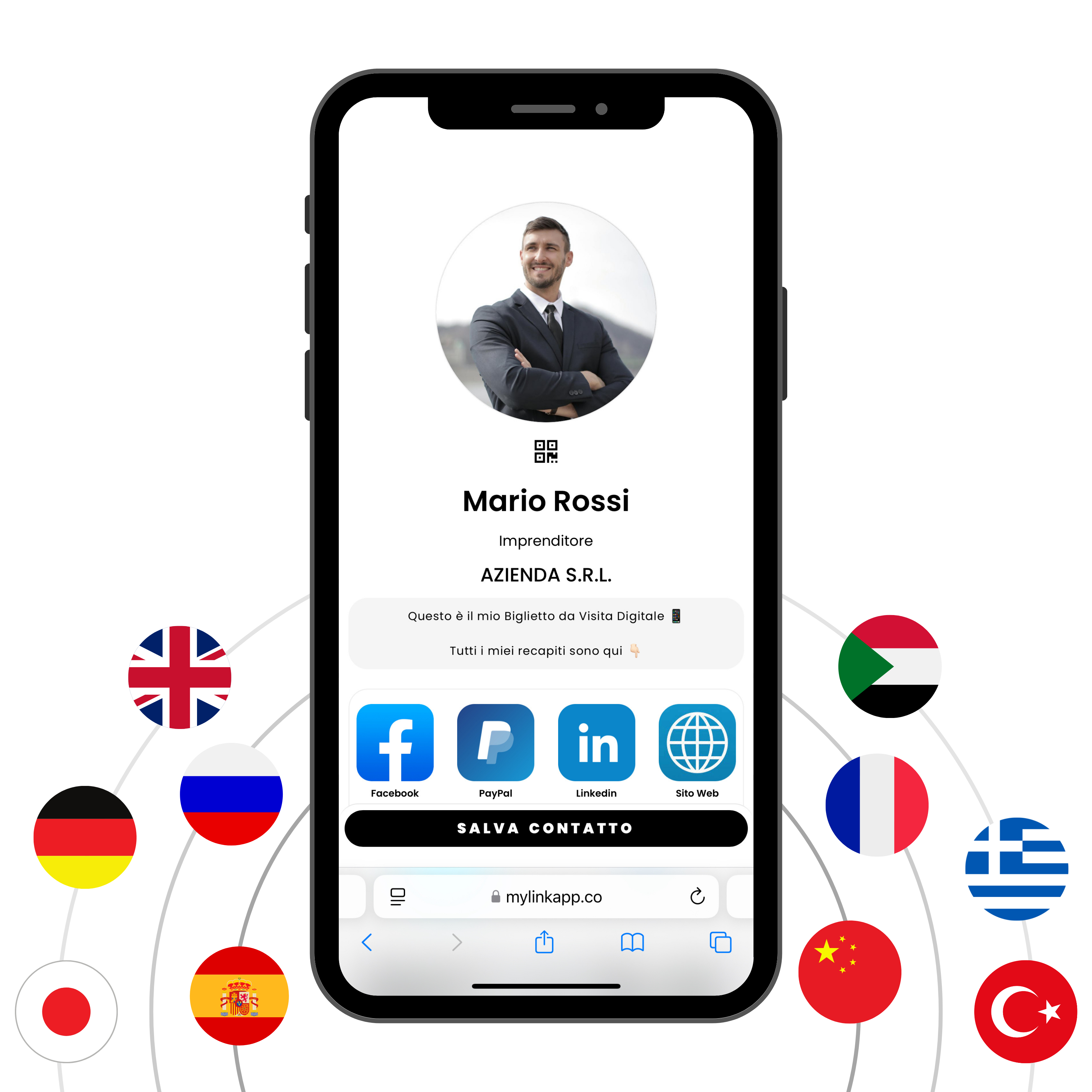 Quando questa funzione è attiva, verrà automaticamente rilevata la lingua dello smartphone della persona con la quale stai condividendo il tuo Biglietto da Visita Digitale myLink e quest'ultimo verrà automaticamente tradotto nella sua lingua... qualunque essa sia.