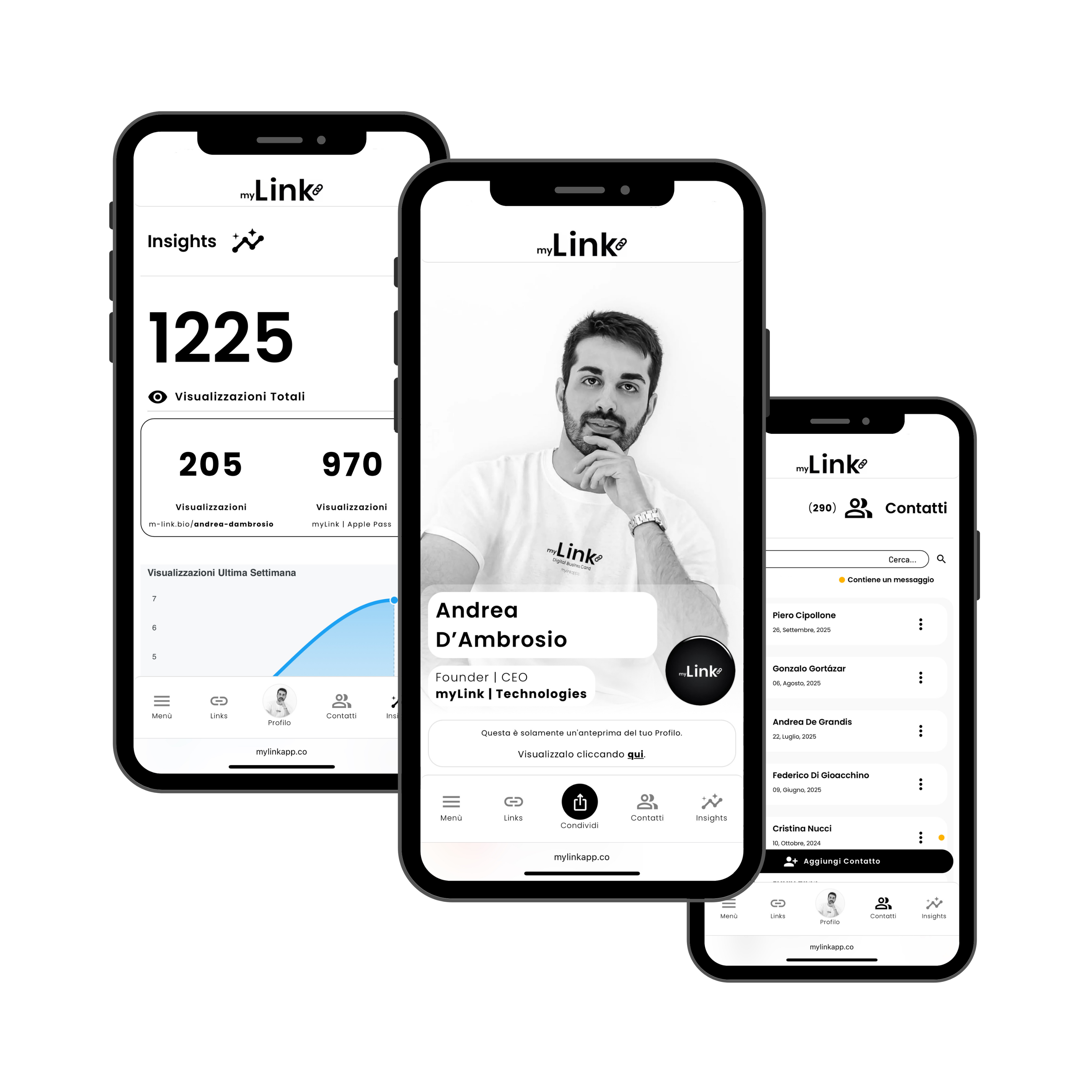 Scambia Contatto è la funzione che permette a chi visualizza il biglietto da visita digitale myLink di condividere facilmente i propri recapiti tramite un modulo presente sul tuo profilo myLink. Con un semplice tap, l’utente può inserire i suoi dati, che verranno salvati automaticamente su myLink e potranno essere esportati o aggiunti direttamente alla rubrica. Un modo rapido ed efficace per facilitare il networking e non perdere mai un contatto importante.