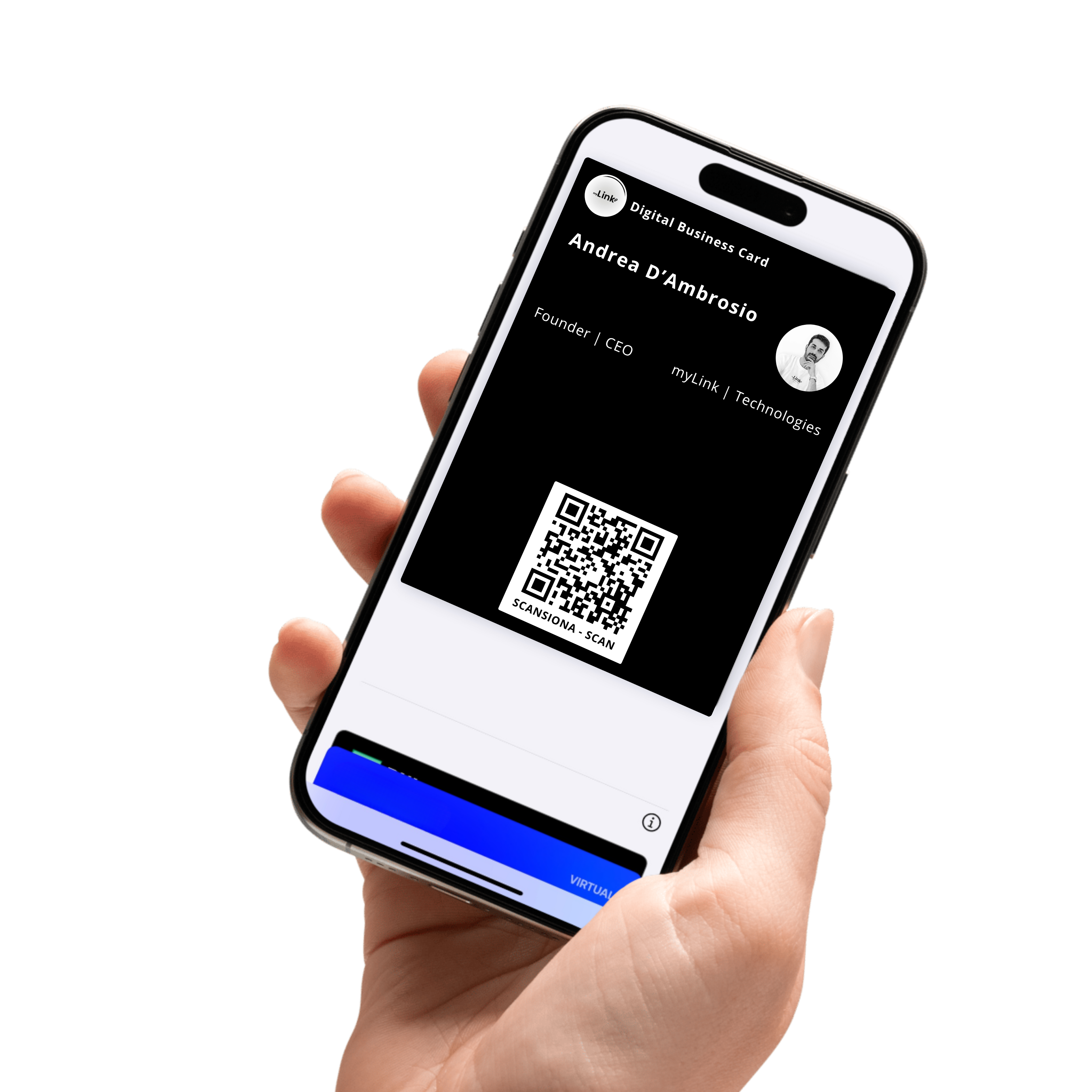 myLink permette di aggiungere il proprio Biglietto da Visita Digitale direttamente nell’Apple Wallet o Google Wallet, rendendolo sempre accessibile dallo smartphone.