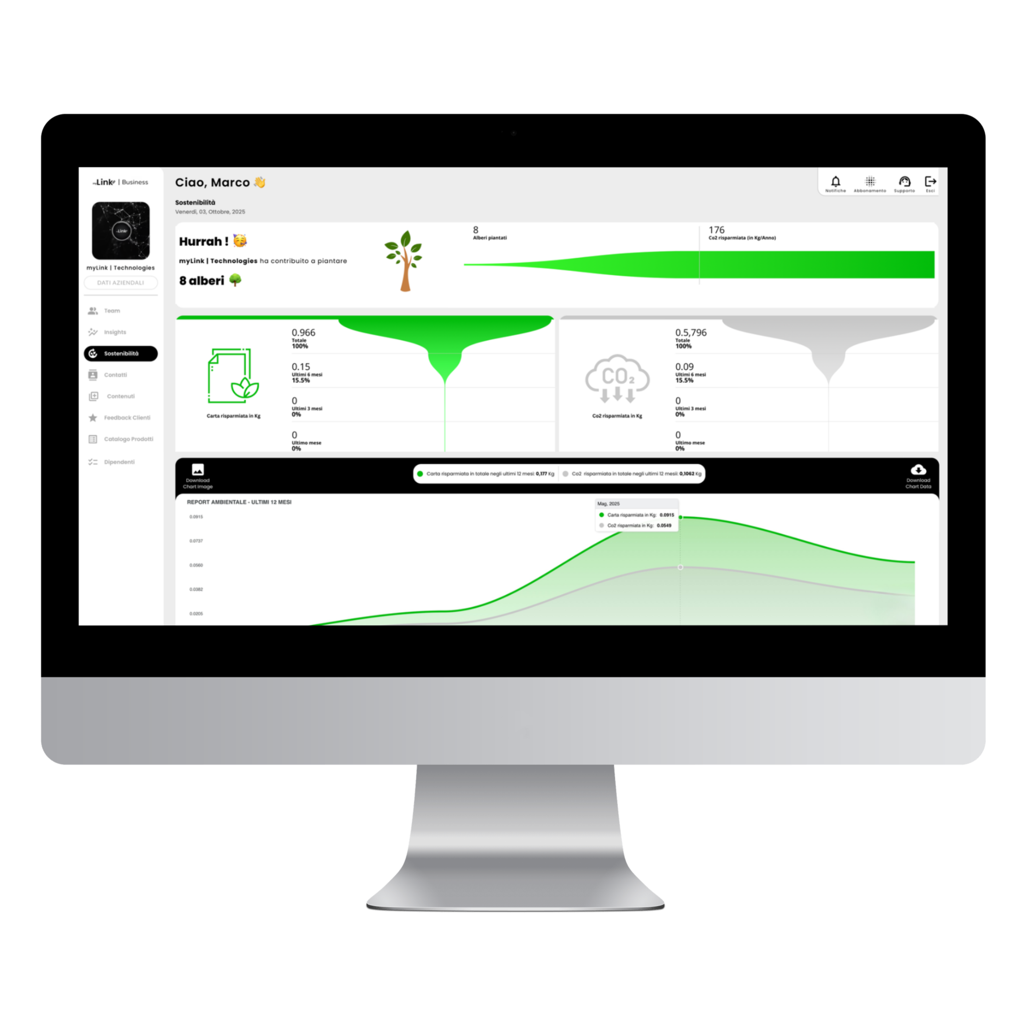 In addition to the trees planted with the purchase, you will be able to view graphs with detailed reports showing the amount of paper and CO2 saved thanks to the use of myLink digital business cards