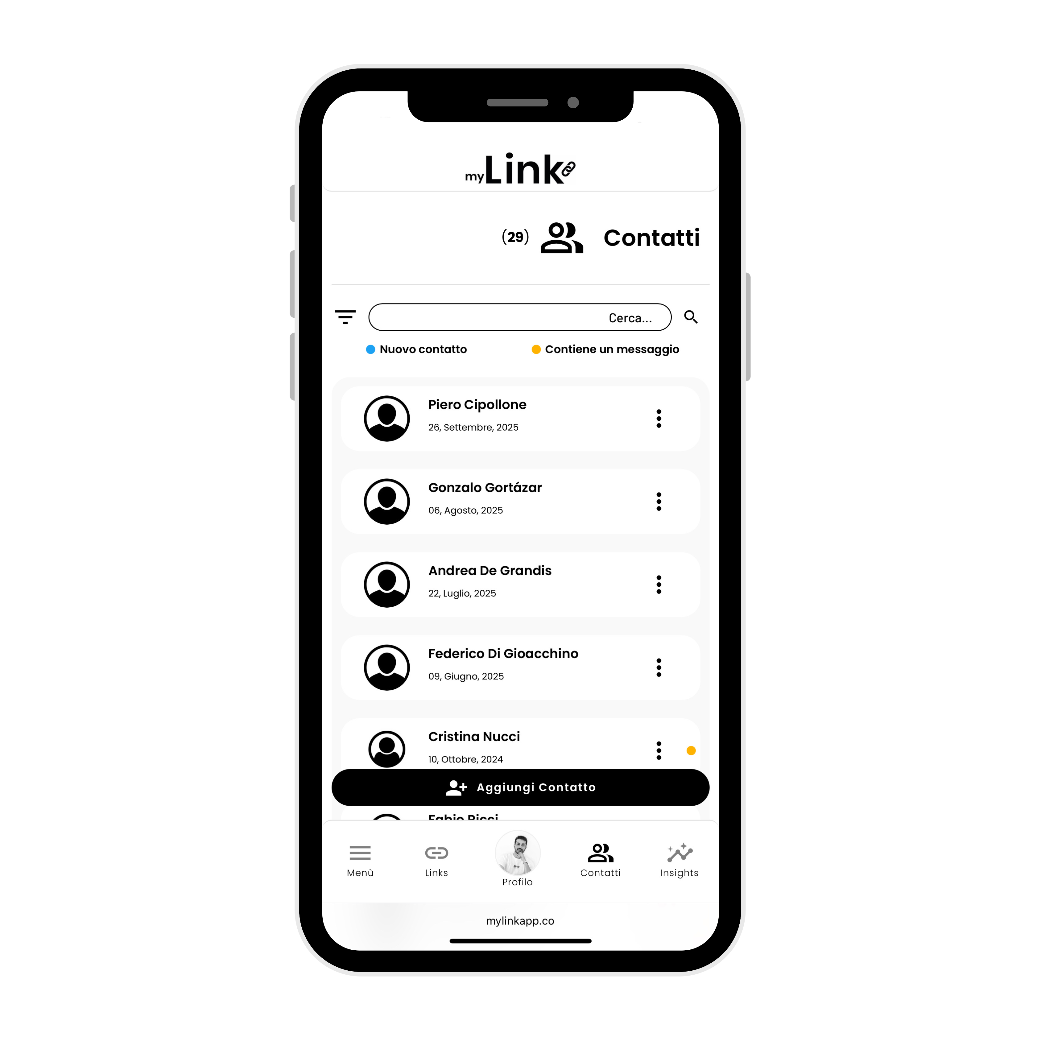 Manage contacts acquired through the use of your myLink or manually add new ones. At any time you can easily consult them to view their contact details, send them an email and much more...