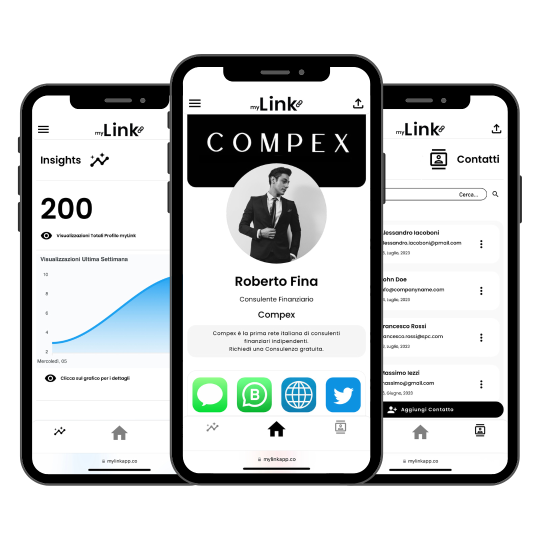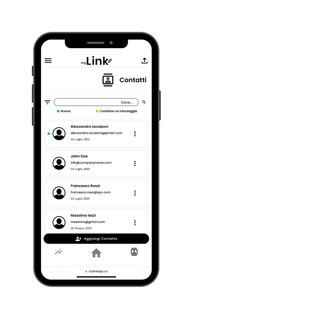 Gestisci i contatti acquisiti tramite l'utilizzo del tuo myLink o aggiungine manualmente di nuovi. In qualsiasi momento potrai facilmente consultarli per visualizzare i loro recapiti, mandare loro una mail e molto altro...