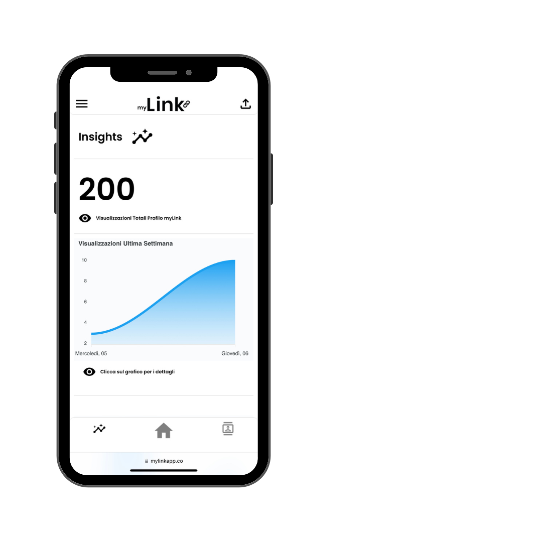 Visualizza grafici di rendimento dettagliati riguardo il tuo Biglietto da Visita Digitale myLink, potrai vedere quante volte e dove viene visualizzato, quante volte viene condiviso e/o salvato, il CTR (Click-through rate) dei contenuti ad esso collegati e molto altro...