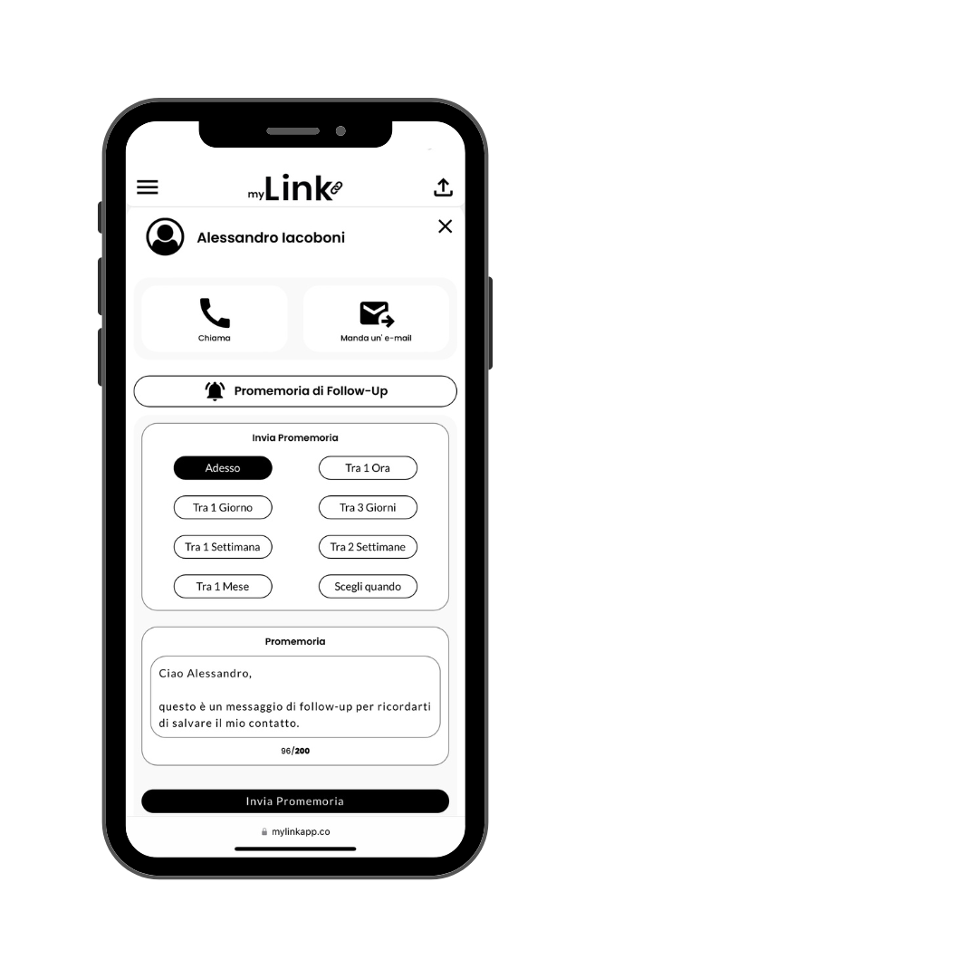 Con myLink puoi inviare o programmare l'invio di promemoria di follow-up personalizzati, così da non perdere l'occasione di rimanere in contatto con la persona incontrata.