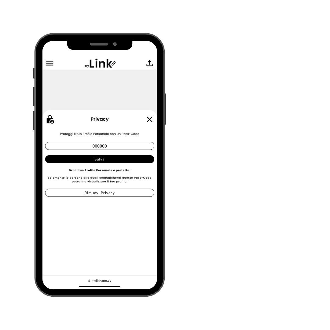 myLink è l'unico Biglietto da Visita Digitale che dispone della Modalità Privacy. Attivando quest'ultima, solamente le persone a cui comunicherai il tuo pass-code potranno visualizzare il tuo Profilo myLink.