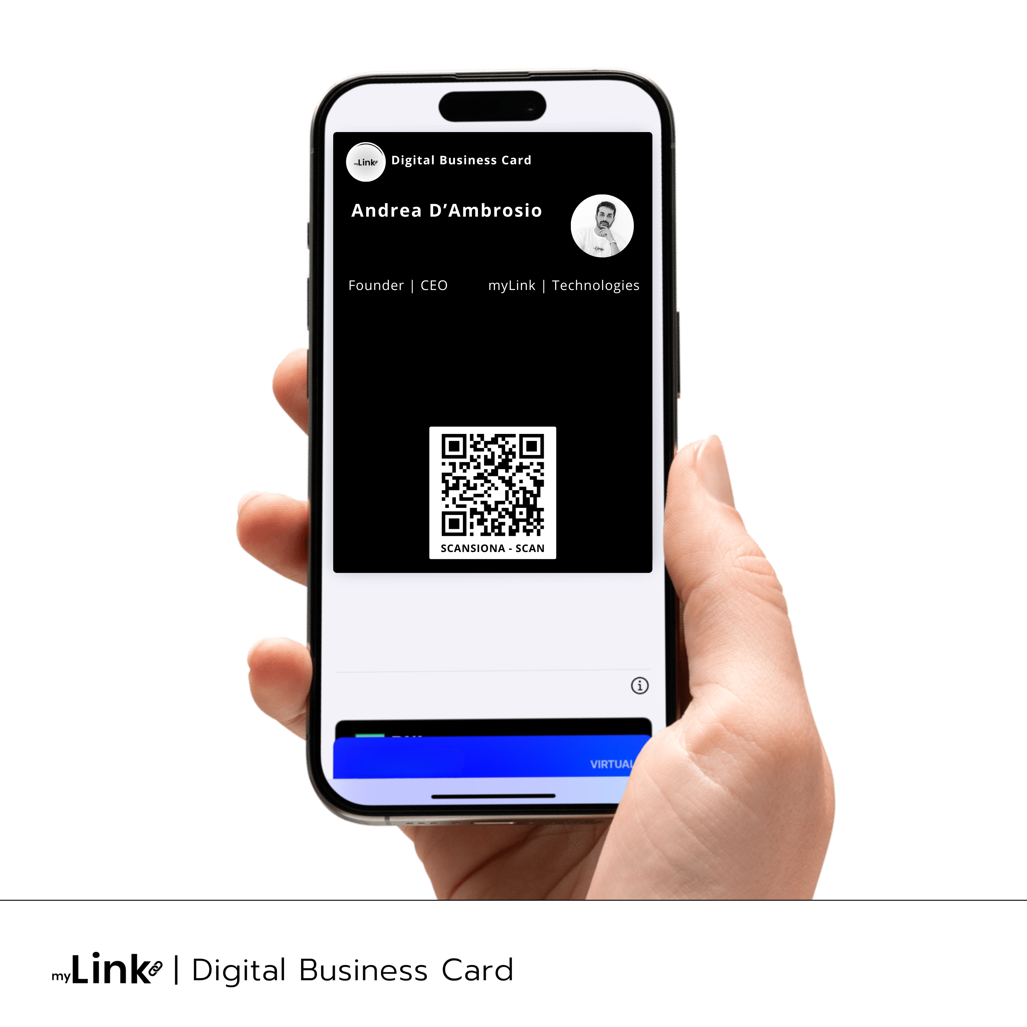 Il tuo Biglietto da Visita Digitale, sempre a portata di mano nel Wallet del tuo smartphone. Condividilo istantaneamente facendo scansione il Codice QR.