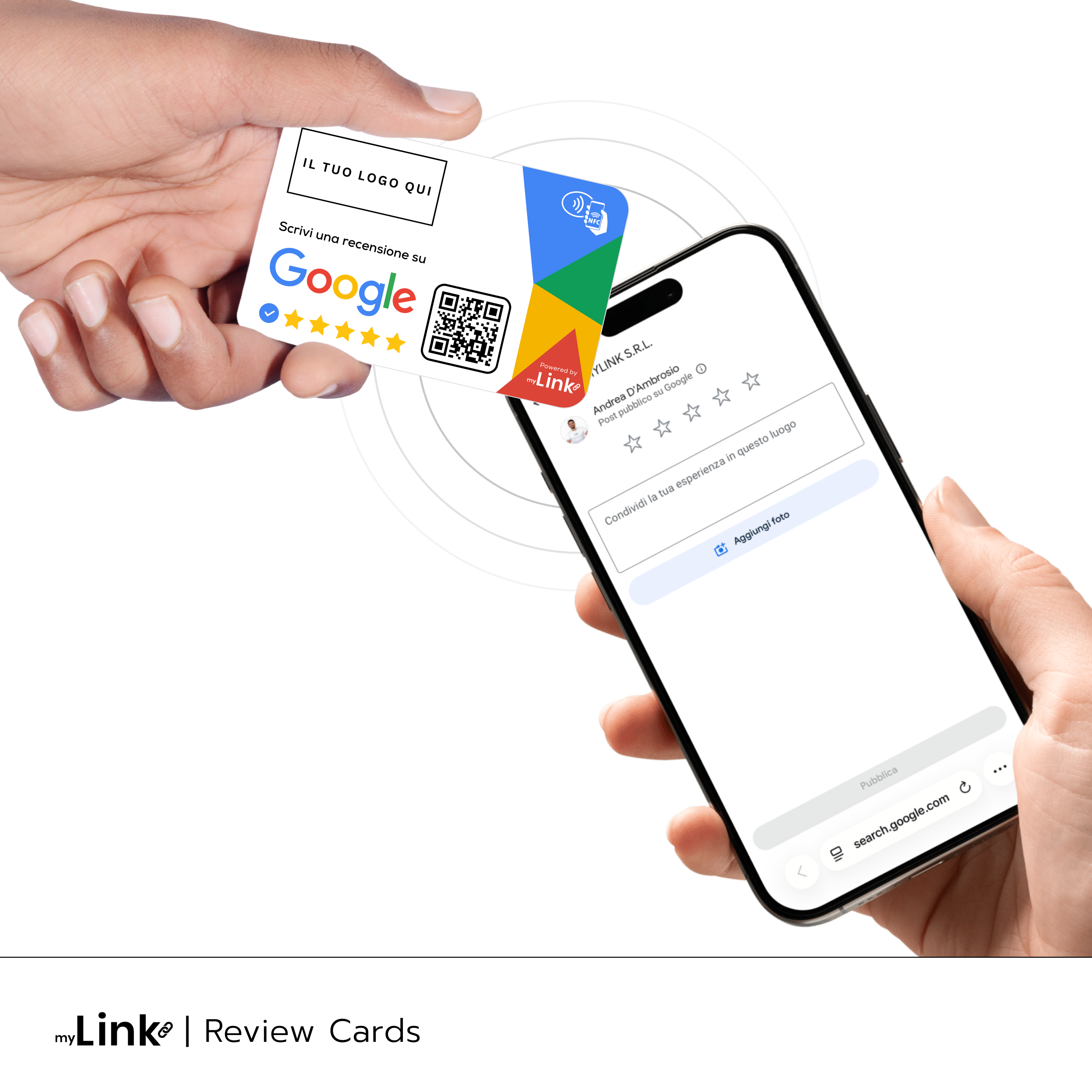 La tessera che facilita le recensioni: i tuoi clienti possono accedere alla pagina della tua attività e lasciare la loro opinione in un istante avvicinando lo smartphone NFC o scassinando il Codice QR.