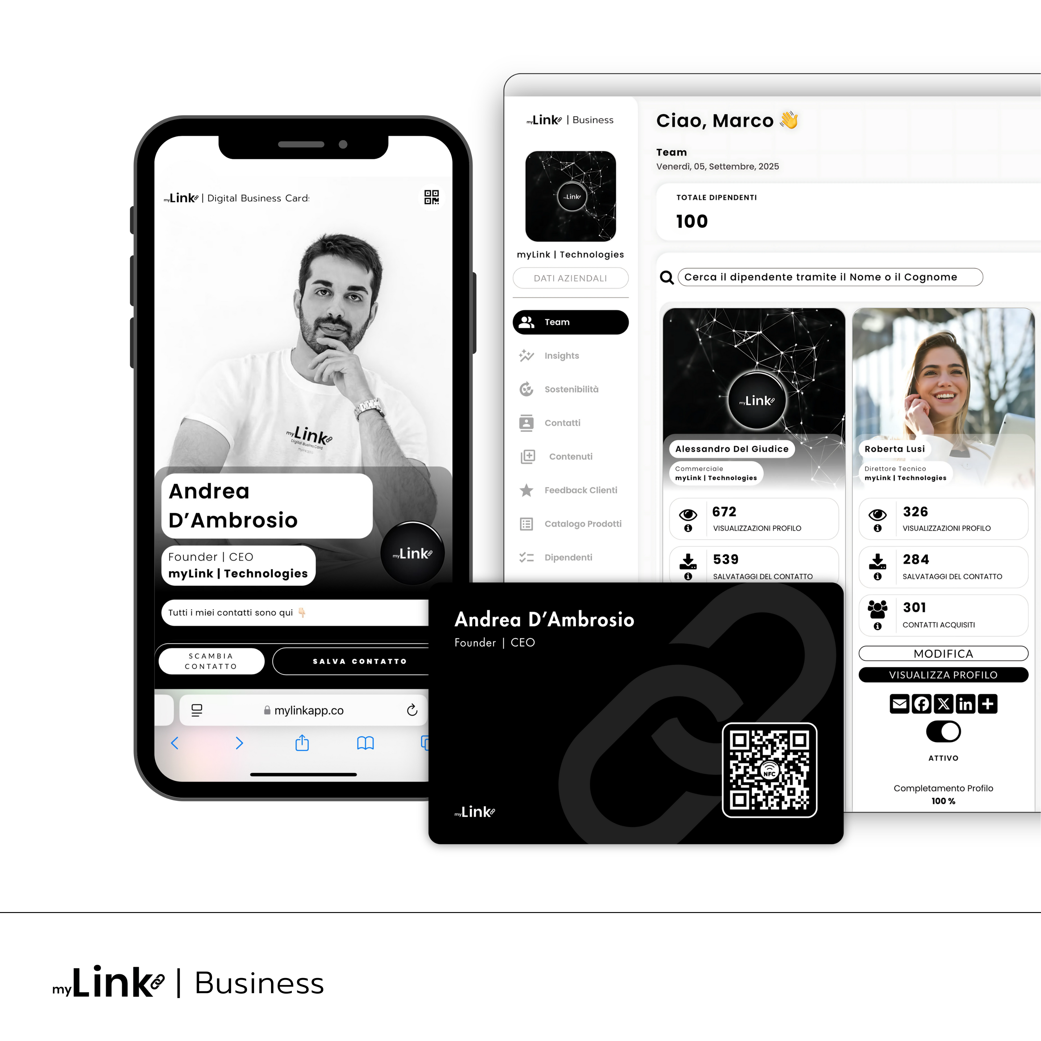 La piattaforma che centralizza la gestione dei Biglietti da Visita Digitali dei tuoi dipendenti e offre dati di utilizzo e report sulla sostenibilità ambientale.